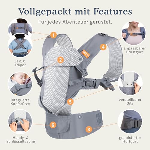Beco Gemini Babytrage von Neugeborenem bis Kleinkind | Ergonomische Babytrage für Babys 3,2–15,8 kg (7–35 lbs) | M-Position, Verstellbarer Sitz, Atmungsaktives 3D-Mesh (Dunkelgrau)