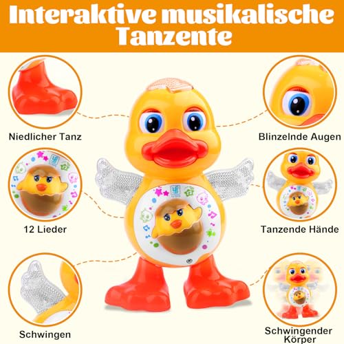 【Interaktives musikalisches Babyspielzeug】Dieses bezaubernde Tanzendes Entenspielzeug begeistert Kinder mit lebendiger Musik, blinkenden Lichtern und lustigen Tanzbewegungen. Es wackelt, dreht und schaukelt und animiert die Kleinen zum Mittanzen und sorgt für endlosen Spaß