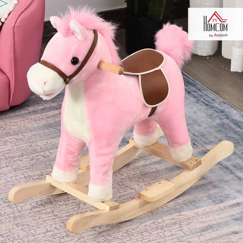 HOMCOM Kinder Schaukelpferd Baby Schaukeltier Pferd mit Tiergeräusche Spielzeug Haltegriffe für 36-72 Monate Plüsch Rosa 65 x 32,5 x 61 cm