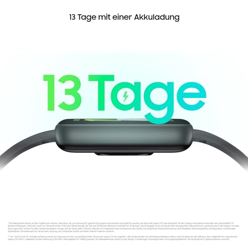 Trainiere viel bei weniger Ladevorgängen: Die Samsung Fitness-Uhr Fit3 hält mit deinem aktiven Lifestyle Schritt und kann bis zu 13 Tage mit nur einer Akkuladung genutzt werden, Lade den Akku in nur 30 min auf bis zu 65% auf ⁵ ⁶
