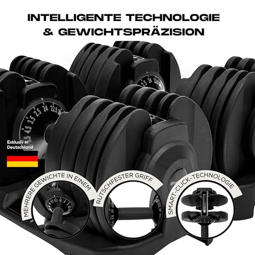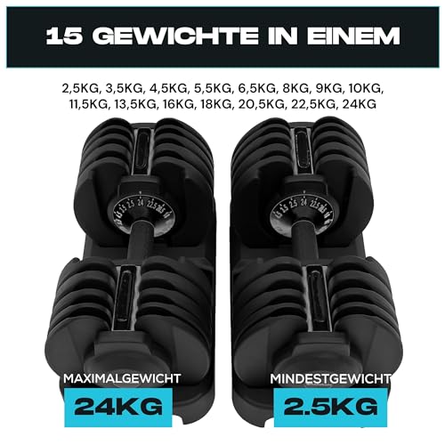 15 GEWICHTE IN EINEM: Konzentrieren Sie sich auf Ihre Form mit unserem fortschrittlichen Verriegelungssystem, das die Gewichte sicher hält. Einfaches Einstellen von 2,5 kg bis 24 kg in präzisen Schritten (2,5 kg, 3,5 kg, 4,5 kg, 5,5 kg, 6,5 kg, 8 kg, 9 kg, 10 kg, 11,5 kg, 13,5 kg, 16 kg, 18 kg, 20,5 kg, 22,5 kg und 24 kg) ganz einfach an Ihre Trainingsanforderungen anpassen.