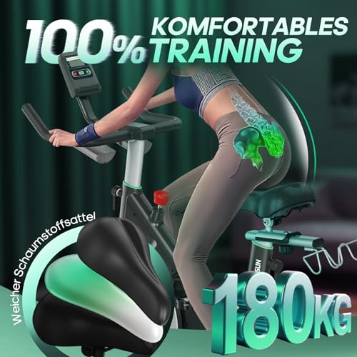 𝐊𝐨𝐦𝐟𝐨𝐫𝐭 & 𝐒𝐭𝐚𝐛𝐢𝐥𝐢𝐭ä𝐭 𝐢𝐧 𝐏𝐞𝐫𝐟𝐞𝐤𝐭𝐢𝐨𝐧: Dieses Hometrainer Fahrrad ist auf Langlebigkeit und Stabilität ausgelegt. Ein verstärkter Stahlrahmen mit 35 % dickeren Rohren trägt bis zu 180 kg. Der breitere Antriebsriemen sorgt für flüssige, geräuscharme Bewegung, während die Sicherungsmutter ein Verrutschen bei hoher Belastung verhindert. Der stoßdämpfende, luftgepolsterte Sattel ist vollständig verstellbar und bietet ergonomischen Komfort – für ein sicheres Training der ganzen Familie.