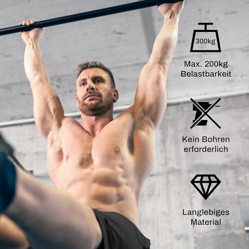 Belastbar bis 300 kg: Dank robuster Konstruktion und Sicherheitsmechanismus ist die Stange extrem stabil – perfekt für Klimmzüge, Beinheben und mehr.
