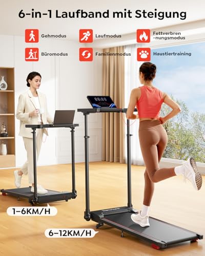 Laufband für Zuhause 12km/h, 6 IN 1 Elektrisches Laufband mit 10% Steigung, 1080MM Einziehbares Steigrohr, 360° Tablet Holder, Controllo App, 2.5HP Leiser Motor, LED Anzeige