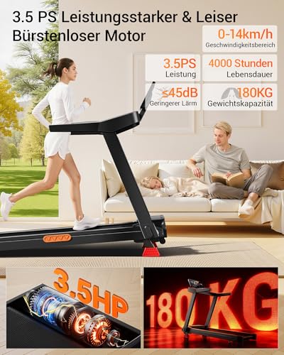 【3,5-PS-Bürstenlosmotor】Der langlebige und kraftvolle 3,5-PS-Motor ermöglicht Geschwindigkeiten von bis zu 14 km/h und trägt problemlos 180 kg – ideal für unterschiedlichste Trainingsanforderungen. Mit einer Geräuschemission von unter 45 dB arbeitet das laufband mit handlauf besonders leise und ist somit perfekt für Wohnungen und Büros geeignet. So können Sie sich voll und ganz auf Ihr Training konzentrieren, ganz ohne störende Geräusche.