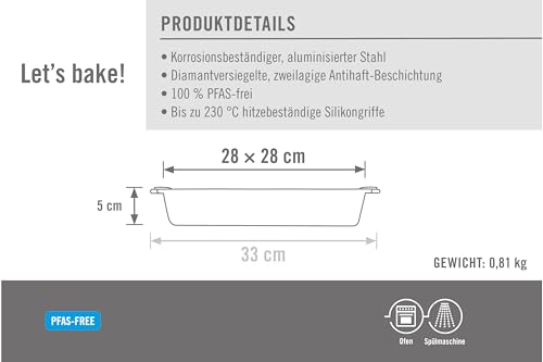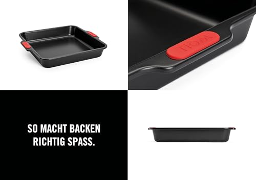 Woll Bakeware Backform viereckig, 28 x 28 cm, mit hitzebeständigen Silikongriffen bis 230°C, PFAS-frei, zweilagige Antihaftbeschichtung, aluminisierter Stahl, schwarz