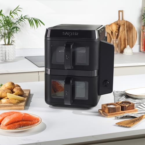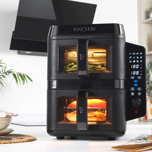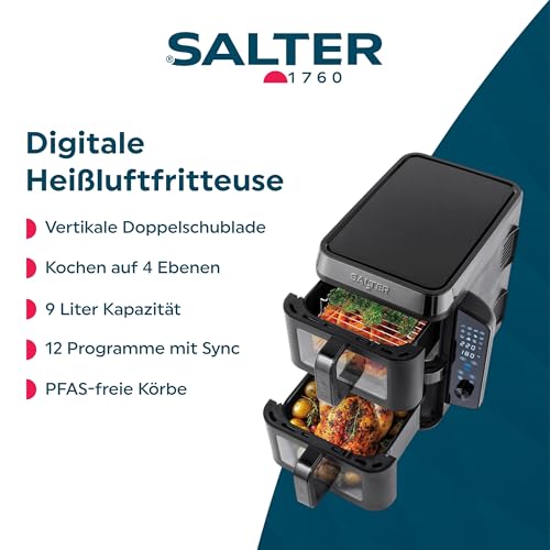 Salter VertiCook View Heißluftfritteuse – Vertikale Doppelschublade, Kochen auf 4 Ebenen, 9L Kapazität in 2 x 4.5L Körben, platzsparend, 12 Kochfunktionen mit Synchronisation & Anpassung, PFAS-frei