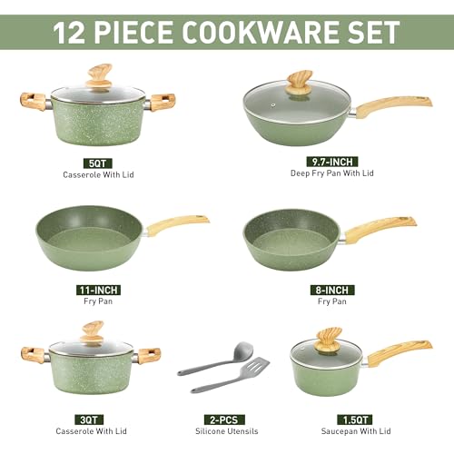 Hochwertiges 12-teiliges Kochgeschirr Set: Es enthält 20cm Bratpfanne, 28cm Bratpfanne, 24.6cm tiefe Bratpfanne mit Deckel, 1.7L (1.5 Quart) Stieltopf mit Deckel, 3.4L (3 Quart) Kasserolle mit Deckel, 5.7L (5 Quart) Kasserolle mit Deckel, 1 x Silikon Pfannenwender,1 x Silikon Kochlöffel.