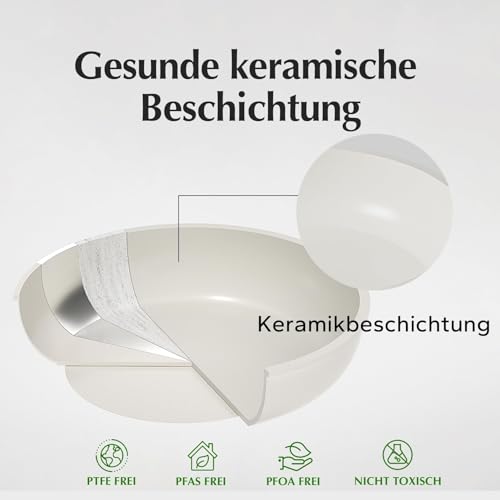 GESUNDE KERAMIKBESCHICHTUNG (PFAS-FREI): Kochen Sie sorgenfrei. Unsere verbesserte Keramik-Antihaftbeschichtung ist zu 100% frei von PFOA, PTFE & Blei. Sie benötigen weniger Öl und die Reinigung ist dank des „Lotus-Effekts“ kinderleicht: Ein einfaches Abwischen genügt, oder geben Sie die Töpfe (ohne Griff) einfach in die Spülmaschine.