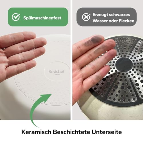 FÜR ALLE HERDARTEN & INDUKTION OPTIMIERT: Frustriert von Pfannen, die auf Induktion nicht erkannt werden? Das Redchef Kochgeschirr besitzt einen vergrößerten, magnetischen Edelstahlboden für schnelle und gleichmäßige Hitzeverteilung auf ALLEN Herdarten (Induktion, Gas, Elektro, Glaskeramik). Zudem sind die Töpfe (ohne Griff/Deckel) bis 450°C extrem backofenfest.