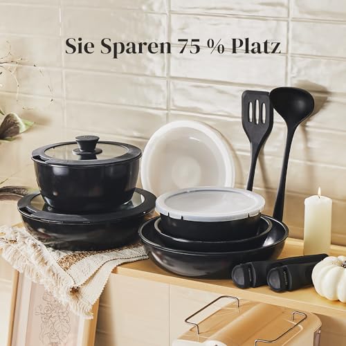 Spart 75 % Platz: Dank der abnehmbaren Griffe und des stapelbaren Designs des Topf-und Pfannensets, das 75 % Platz spart und sich perfekt aufbewahren lässt, ist das abnehmbare, flache Keramik-Topf-und Pfannenset von Redchef perfekt für die Küche, das Camping und das Caravaning