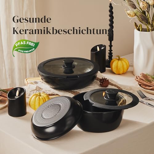 Gesunde keramische Beschichtung: Dieses Kochgeschirr verfügt über eine fortschrittliche und langlebige Keramikbeschichtung, die frei von PFOA, PTFE und PFAS ist, wodurch es sicher und gesund ist, mit weniger Öl und Rauch zu kochen; selbst bei Überhitzung entstehen keine Gase und die Beschichtung löst sich nicht von den Lebensmitteln ab.Das Redchef Kochgeschirr-Set macht Ihr tägliches Kochen sicherer und gesünder