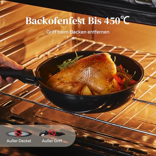 Oven & Spülmaschinensicher: Der Boden des Kochers besteht aus einer Schicht Aluminiumguss, die magnetisch leitfähig ist und eine größere Heizfläche für eine schnellere und gleichmäßigere Wärmeverteilung bietet. Geeignet für Gasherde, Backöfen, Mikrowellen, Geschirrspüler, Elektrokochfelder, Keramikkochfelder, Halogenkochfelder und Induktionskochfelder. Backtemperaturen bis zu 450°C (Griffe abnehmen, wenn die Pfanne in den Ofen gestellt wird)