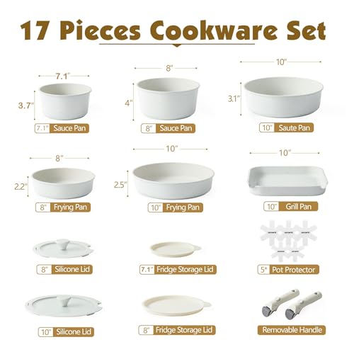 SENSARTE Topfsets Pfannenset 17 Teiliges, Antihaft Kochgeschirr mit Abnehmbarem Griff, Für alle Herdarten geeignet, Spülmaschinenfest, Ofenfest (Weiß)