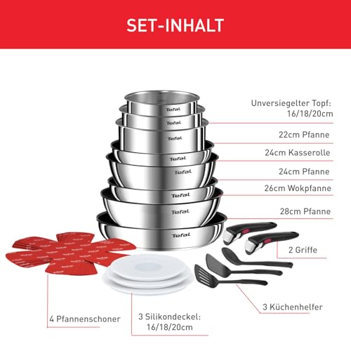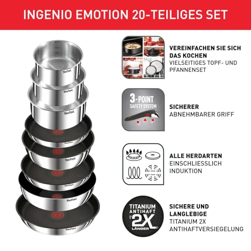 Tefal Ingenio Emotion 20-tlg. Topf und Pfannenset abnehmbarer Griff, mit Zubehör, stapelbar, platzsparend, Topfset Induktion Titanium 2X Antihaftversiegelung, einfache Handhabung und Reinigung, L897SK