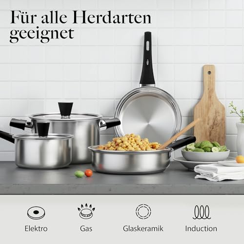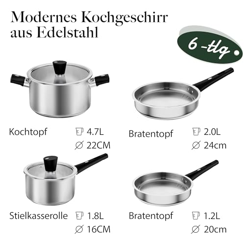 Topfset 6-Teilig Kochtopfset Induktion Töpfe Kochtopf Pfannenset Edelstahl Cookware Set Mit Deckel Verbrühungsschutz Griff, Induktionstopf für alle Herdarten geeignet, Unbeschichtet, Spülmaschinenfest