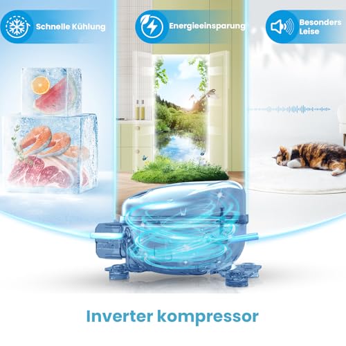 Inverter-Kompressor: Mit fortschrittlicher Inverter-Kompressor-Technologie ist dieser Kühlschrank energieeffizient, hält die Temperatur stabil, läuft mit einem niedrigen Geräuschpegel von nur 39 Dezibel und hat eine lange Lebensdauer