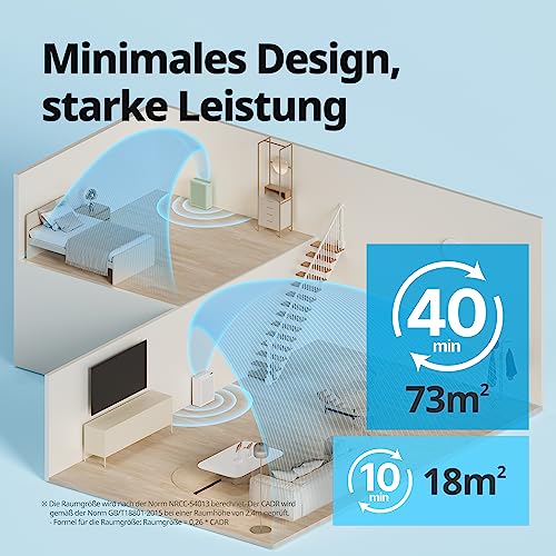 【 LEISTUNGSSTARKE LUFTREINIGUNG 】 Mit einer Clean Air Delivery Rate (CADR) von 281 m³/h reinigt dieser Luftreiniger Räume bis zu 73㎡ effektiv. Für kleinere Räume bis zu 29㎡ kann er eine intensive Reinigung innerhalb von nur 15 Minuten erreichen, was eine schnelle Verbesserung der Luftqualität gewährleistet
