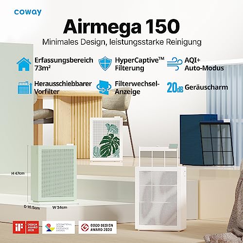 COWAY Luftreiniger Allergiker, Quietmark, 20dB Schlafmodus, Entfernt 99,999% der schädlichen Partikel bis zu 0,01 µm, für Allergie (ECARF Siegel) Staub Pollen – AIRMEGA 150 (Marine)