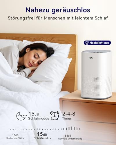 Flüsterleiser Schlafmodus und Stimmungsbeleuchtung: Unser leiser Luftreiniger verfügt über einen Schlafmodus mit einem Geräuschpegel von nur 15 dB, der Ihnen ein unvergleichliches Schlaferlebnis bietet und gleichzeitig für stets frische und saubere Luft sorgt. Zusätzlich ist er mit einer variablen Stimmungsbeleuchtung ausgestattet, die Sie nach Belieben ein- und ausschalten können, um eine angenehme Beleuchtung und eine ruhige Schlafumgebung zu schaffen.