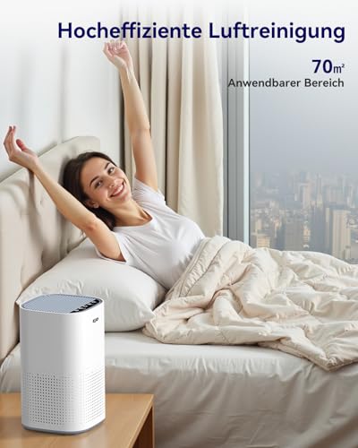 Luftreiniger für große Schlafzimmer bis zu 70 m² mit CADR 223 m³/h, leiser H13 HEPA-Luftreiniger mit 15 dB Schlafmodus, 3-in-1-Filter entfernt 99,97% Pollen, Staub, Tierhaare, Gerüche (Weiß)