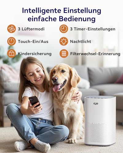 Dreistufige Hocheffizienzfiltration: Der Luftfilter besteht aus einem Vorfilter, einem H13-HEPA-Filter und einem Aktivkohlefilter. Er ist CARB/CE/DOE-zertifiziert und filtert Partikel bis zu einer Größe von 0,3 Mikrometern. Zudem entfernt er 99,97 % Tierhaare, Staub, Pollen, Rauch, Gerüche und vieles mehr. So wird die Raumluftqualität effektiv verbessert und die Atemwegsgesundheit von Ihnen und Ihrer Familie geschützt.