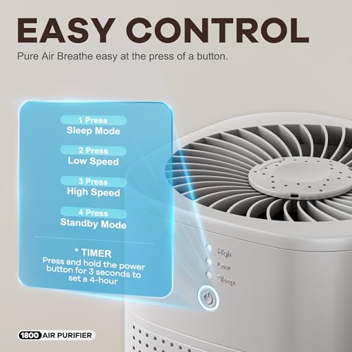 Ein-Knopf-Bedienung: Dieser tragbare luftreiniger für Raucherzimmer – perfekt auch für Schlafzimmer – zeichnet sich durch einfache Bedienung, Effektivität und Praktikabilität aus. Die praktische Ein-Knopf-Bedienungsfunktion ermöglicht das mühelose Umschalten zwischen drei Geschwindigkeitsstufen und dem Timer-Modus. Halten Sie den Knopf drei Sekunden lang gedrückt, um für diesen luftreiniger für Raucherzimmer einen 4-Stunden-Timer einzustellen
