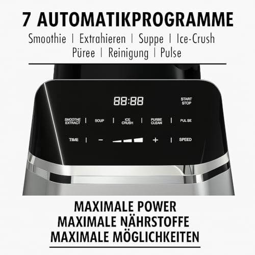 Vielseitig und effizient: Mit 7 intelligenten Automatikprogrammen wie Smoothie, heiße Suppe oder Ice Crush und manuellen DIY-Einstellungen gelingen unzählige Rezeptideen im Handumdrehen.