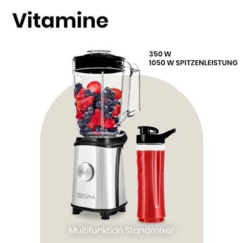ZEEGMA Vitamine Multifunktion 4-in-1 Standmixer 1050W mit 1L Krug, Elektrischer Juicer Blender, Smoothie Maker mit Safe Lock, Kaffeemühle, Kreuzklingen, 2x Klingen-Sätze (1l 1050W)