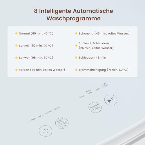 【Heißwaschoptionen】 Diese T02 Mini Waschmaschine verbessert die Reinigungsleistung, indem sie das Wasser in häufig genutzten Programmen auf 40 °C oder 60 °C erhitzt. So löst sie selbst hartnäckige Flecken leicht, eliminiert Bakterien und Allergene. Für die meisten pflegeleichten Textilien geeignet, sorgt diese Funktion für die Hygiene-Bedürfnisse Ihrer Familie.