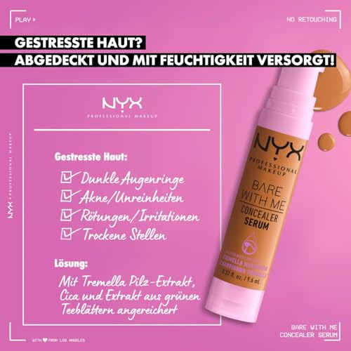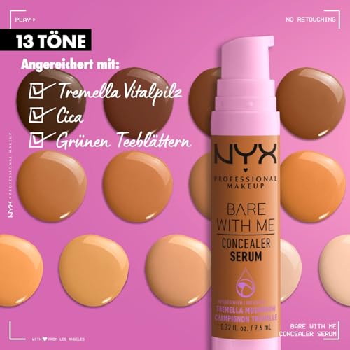 Das NYX Professional Makeup Bare With Me Concealer Serum kombiniert die Wirksamkeit eines Serums mit den Vorteilen eines Concealers. Bereits nach kurzer Zeit erlangt die Haut einen Zustand der Erholung. Mit dem Skin Recovery Serum werden dank kraftvoller Medium-Deckkraft Unebenmäßigkeiten auf der Haut kaschiert, rote oder entzündete Hautstellen werden gemildert. Die atmungsaktive Formel passt sich jedem Hautton an und lässt sich besonders leicht verblenden – für ein natürliches Finish. Das enthaltene Extrakt des Tremella-Pilzes wirkt entzündungshemmend und hydratisiert die Haut, ohne die Poren zu verstopfen. Grüner Tee und Cica sorgen dafür, dass irritierte Haut besänftigt und beruhigt wird.