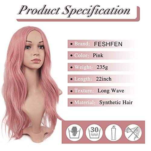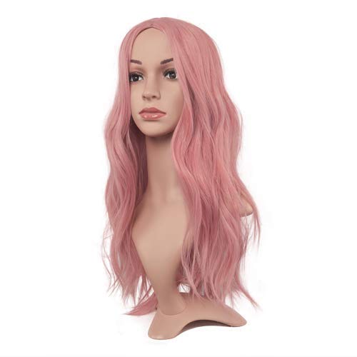FESHFEN Lange Lockige Rosa Perücke, 60 cm Mittelscheitel Frauen Perücken Natürlich synthetische Perücken Damen Locken Wavy Wig für Party Täglich Long Wavy Wig