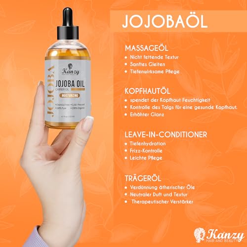 Kanzy Jojobaöl Bio Kaltgepresst 100% Reines Gold, 120ml für Haut, Haare und Nägel, Gesichtsöl und Körperöl, Vegan & Hexanfrei, Bio Jojobaöl, Anti-Falten, Natürliche Intensiv Feuchtigkeitspflege