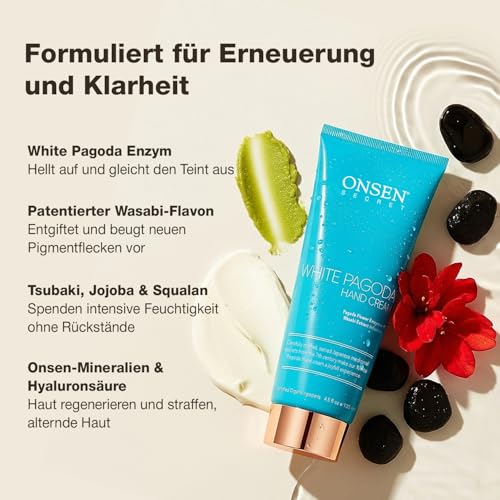 Entdecken Sie das Geheimnis junger Haut und intensiver Feuchtigkeit mit der Anti-Aging-Handlotion mit Sheabutter Onsen Secret Inspiriert von japanischen Schönheitsritualen kombiniert unsere einzigartige Formel Pagodenbaumblüten und Flavone-Wasabi, um Rötungen zu reduzieren und die Haut zu klären. Sheabutter und Hyaluronsäure versorgen Ihre Hände mit reichhaltiger Feuchtigkeit und hinterlassen Ihre Haut seidig weich. Umweltfreundlich und hergestellt in den USA. Unsere Lotion ist frei von Parabenen und Tierversuchen, um eine umweltfreundliche Pflege für Ihre Haut und Umwelt zu gewährleisten. Ideal für trockene und geschädigte Hände, bringt diese Creme Komfort und Weichheit in den Alltag. Tragen Sie es zu jeder Tageszeit großzügig auf für wunderschön hydratisierte Hände und ein Gefühl des Wohlbefindens. Gönnen Sie sich mit Onsen Secret den Luxus einer natürlichen und effektiven Handpflege.