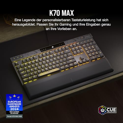 Paketinhalt: CORSAIR K70 MAX RGB Magnetisch-mechanische Gaming-Tastatur | Magnetische gepolsterte Handballenauflage aus Kunstleder | Abnehmbares USB-Typ-C-auf-Typ-A-Kabel | CORSAIR Logo-Taste | Strahlende Leertaste | Tastenkappenabzieher | Sicherheitsinformationen | Garantiekarte | CH-910961G-DE