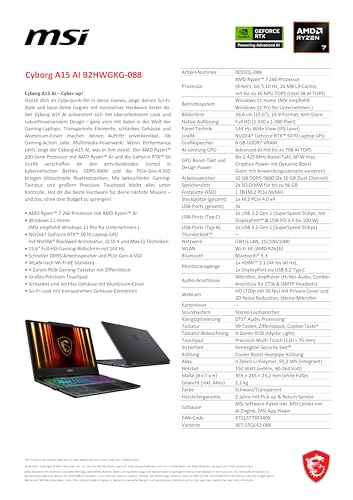 MSI Cyborg A15 AI, Gaming-Laptop, 15,6″ Full-HD 144 Hz Display, AMD Ryzen 7 260, NVIDIA GeForce RTX 5070, 32 GB DDR5, 1 TB SSD, Windows 11 Home, QWERTZ Tastatur, Schwarz, B2HWGKG-088