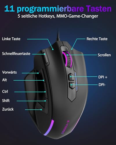 【Real CustomizableEcht anpassbar 】16,8Millionen RGB-LED-Farboptionen, 4 Beleuchtungsmodi (LED-Hintergrundbeleuchtung kann deaktiviert werden). 11 programmierbare Tasten können per Software einfach all Ihren wichtigen Fähigkeiten, Makros, Elementen usw. zugeordnet werden (𝐃𝐨𝐰𝐧𝐥𝐨𝐚𝐝: bit.ly/X-41PRO). Tastaturkombinationsfunktionen können durch Tastenklicks erreicht werden, wodurch Ihr Arsenal an Zaubersprüchen (Aktionen) und die Reaktionszeit reduziert werden und Sie in jeder Spielszene effizient gewinnen können.
