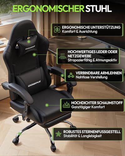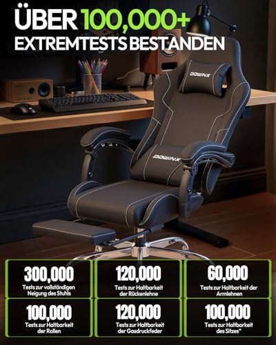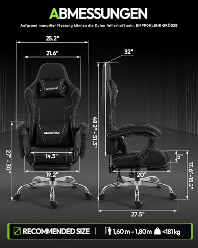 Dowinx Gaming Stuhl Bürostuhl Massage Gaming Sessel mit höhenverstellbaren Linkage-Armlehnen, ergonomischer Gamer Stuhl mit Fußstütze, gepolstert Gaming Chair 150° neigbar bis 180 kg, Schwarz