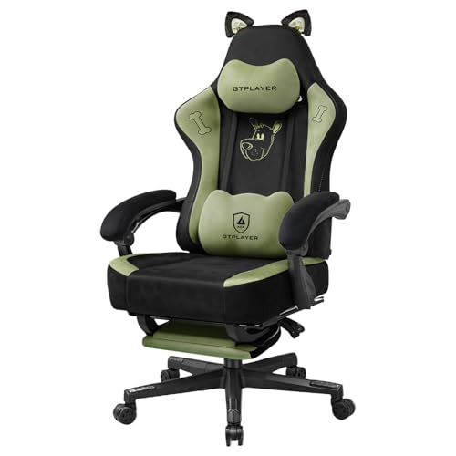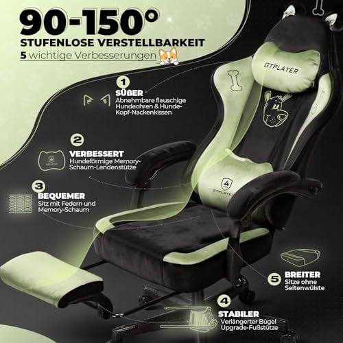 GTPLAYER Niedlicher Gaming Stuhl mit Samtstoff, Gaming Chair, ergonomischer Bürostuhl Gamer Stuhl mit Katzenohren, Memory-Schaum und Fußstütze, 150kg, Grün