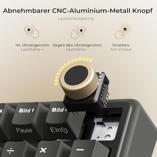 【PBT-Keycaps & abnehmbarer Lautstärkeregler】Die Gaming Tastatur verfügt über einen präzisen CNC-Alu-Drehknopf für schnelle Lautstärkeregulierung – dieser kann bei Bedarf einfach abgenommen oder umpositioniert werden. PBT-Keycaps mit Doppelspritztechnik: matt, abriebfest und extrem haltbar
