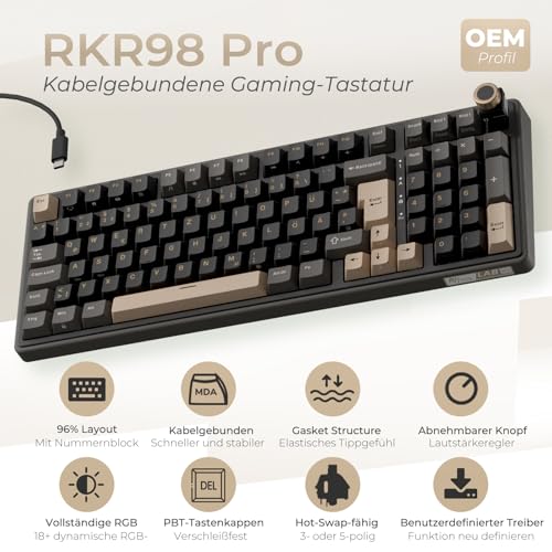 RK ROYAL KLUDGE R98 Pro Mechanische Tastatur Kabel, 96% Gasket Gaming Tastatur QWERTZ RGB mit Nummernblock und Knopf, PBT-Tastenkappen, Hot Swap Linearer Creamy Switches