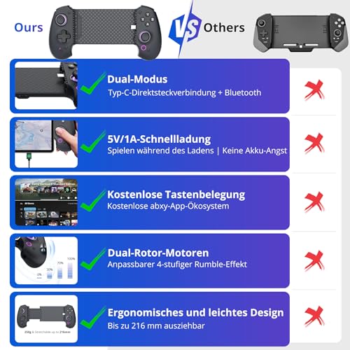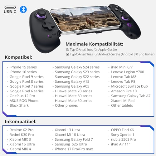 [Handheld-Qualität für Gaming auf USB-C-Geräten] Vollständig kompatibel mit iPhone 15/16/17, iPad Mini 6/7 sowie Android-Geräten wie Samsung, Google Pixel, Motorola, ROG und Legion. Ausziehbar bis zu 216 mm – passt für Tablets bis zu 8,8 Zoll und ermöglicht vielseitiges, unterbrechungsfreies Gaming. Keine Unterstützung für faltbare Smartphones.