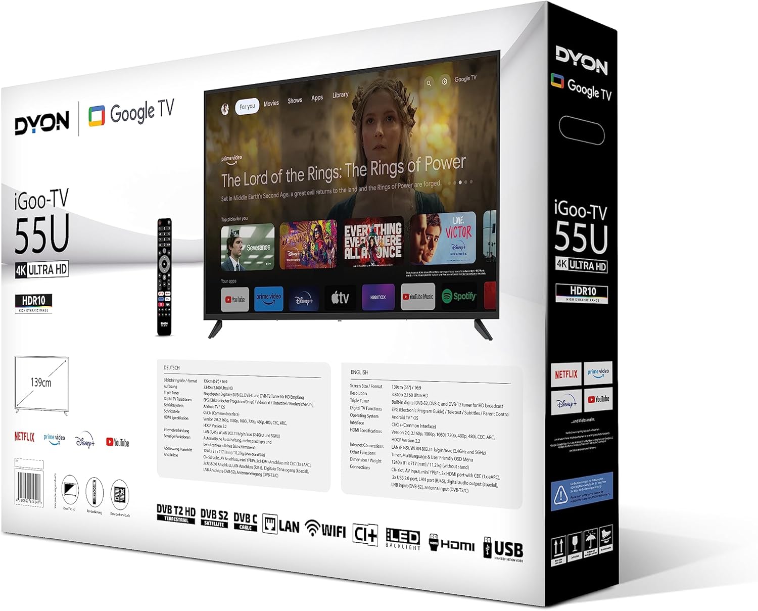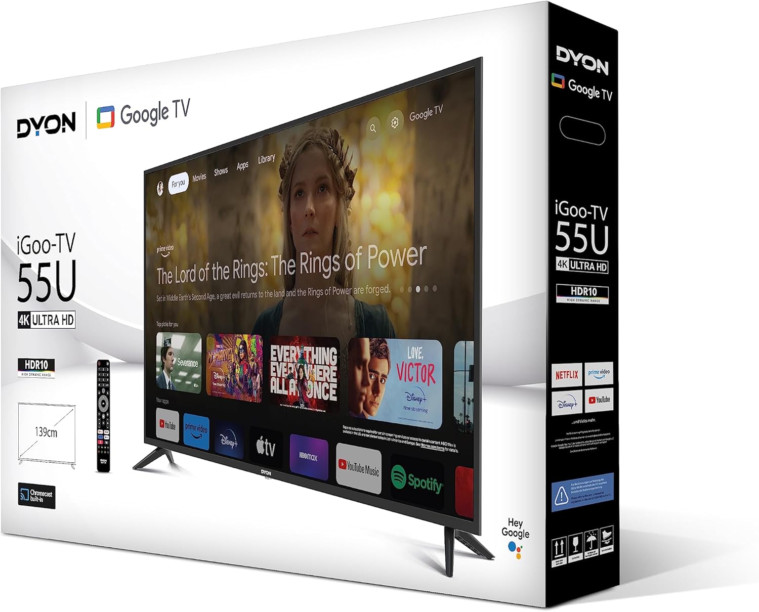 DYON iGoo-TV 55U – 55 Inch 4K Ultra HD Smart LED TV with Google TV, HD Triple Tuner, Voice Control, Netflix, Prime Video, YouTube, DAZN, Disney+