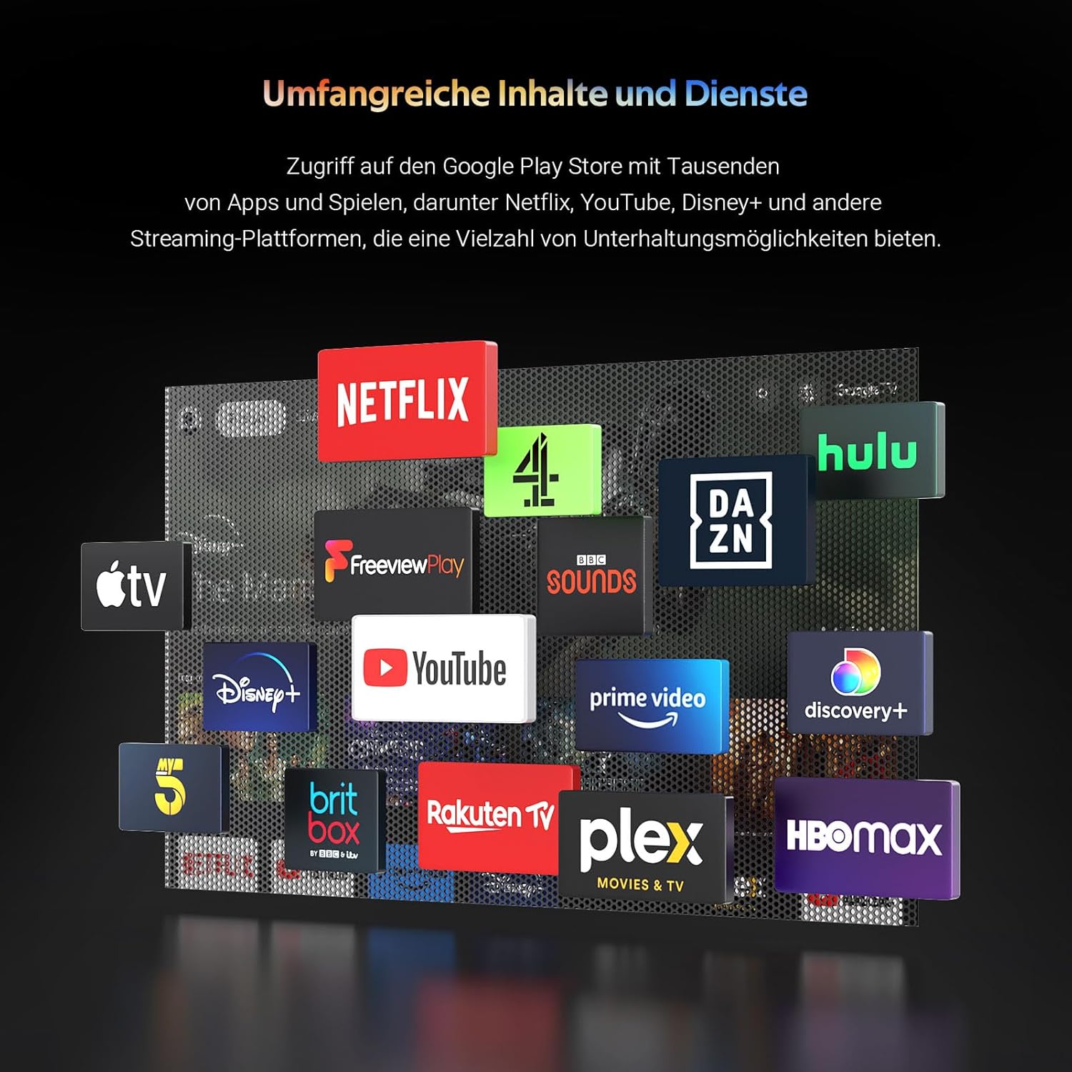 Bluetooth-Sprachunterstützung: Die Sprachfernbedienung ermöglicht den schnellen Zugriff auf Inhalte und Apps. Mit integriertem Cast können Sie auf Ihrem Telefon oder Tablet abgespielte Inhalte über Cast in derselben Wi-Fi-Umgebung auf Ihren Fernseher streamen.