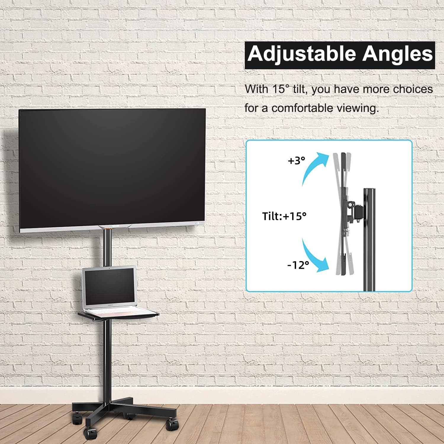 Verstellbarer TV-Ständer – Mit den Einstellfunktionen für den Winkel von 3° nach oben und 12° nach unten können Sie eine bequeme Haltung wählen, um Blendung zu reduzieren und das Seherlebnis zu verbessern. Es ist nicht nur ein rollender TV-Ständer, sondern auch ein praktischer großer TV-Wagen für zu Hause.