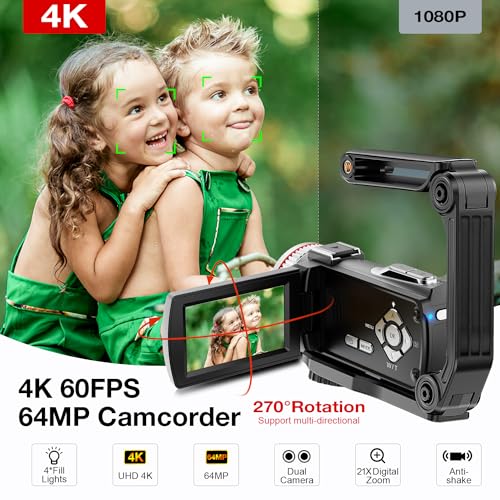 Videokamera 4K 64MP Camcorder Vlogging Kamera für YouTube,21X Digital Zoom, 3″ 270° Drehbarer Screen Video Vlogging Dual Camera mit 64GB Karte, Mikrofon, Stabilisator, Fernbedienung,2 Batterien