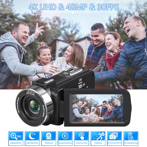 Videokamera 4K Camcorder 48MP mit IR Nachtsicht, 18X Digitalzoom 30FPS Video Kamera Recorder, 3.0-Zoll-LCD Touchscreen Webcam Vlogging Camera für YouTube mit Fernbedienung, SD-Karte und 2 Akkus