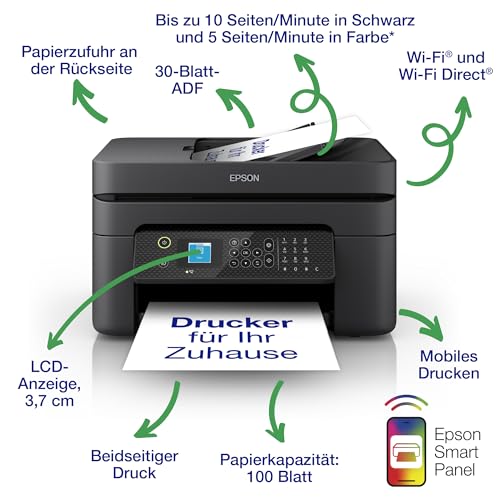 FLEXIBLE WLAN-LÖSUNGEN – Drucken Sie von überall im Büro aus über WLAN oder mithilfe von Wi-Fi Direct auf kompatiblen WLAN-Geräten auch ganz ohne WLAN. Darüber hinaus können Sie mit der Smart Panel-App von Epson Ihren Drucker von Ihrem Smart-Gerät aus steuern, Dokumente drucken und Fehler beheben*.