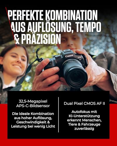 Canon EOS R7 Systemkamera mit RF-S 18–150mm Objektiv – 32,5 MP APS-C CMOS-Sensor – Dual Pixel CMOS AF II, integrierte Bildkombination, UVC/UAC-kompatibel – Perfekt, um Naturmomente einzufangen