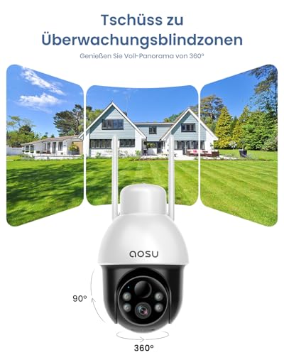 【 360° Überwachung + Fernzugriff】 Solar Kamera Wlan Outdoor Beseitigen Sie blinde Flecken mit einer 347°-Drehung und einem 90°-Neigungswinkel. Über die aosu-App können Sie die kabellose überwachungskamera fernsteuern – sehen Sie, was passiert, sprechen Sie mit Besuchern oder beruhigen Sie Ihre Lieben, egal wo Sie sich befinden.